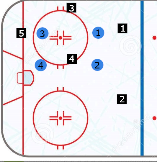 Players 4 and 5 are also in an ideal situation to collect rebounds for high-danger, close in shots or from tipping shots coming from the players back at the blue line.
